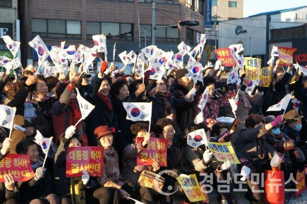 (진주/조권래 기자) = 진주지역 재향군인회, 진주문화원 등 보수관련단체 회원들이 주축이돼 결성한 '진주호국안보시민단체총연합회 (회장 김진수, 진주연합회)'는 지난 24일 오후 4시께부터 중앙동 진주대첩 기념광장 조성지에서 '대통령 하야반대 시민 결의대회'를 가졌다.