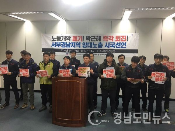 (진주/조권래 기자) = 서부경남 양대 노총인 한국노총 경남서부지역지부(지부장 조경욱)와 민주노총 진주지역지부(지부장 강수동)는 28일 진주시청 브리핑룸에서 '노동 개악 폐기! 박근혜 즉각 퇴진!'을 요구하며 시국선언문을 발표했다.
