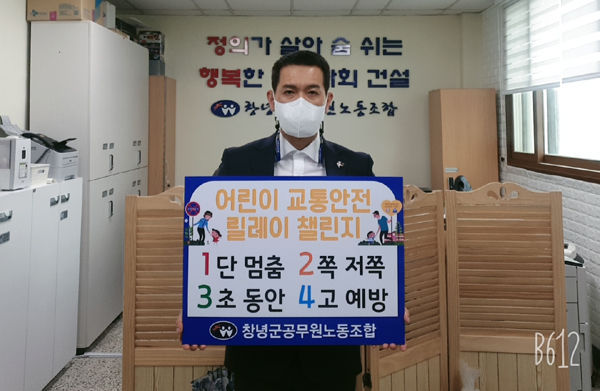 [경남도민뉴스] 창녕군공무원노동조합(위원장 윤석민)은 15일 어린이 교통안전에 대한 사회적 관심과 어린이 보호 문화 확산을 위한 ‘어린이 교통안전 챌린지’에 동참했다.