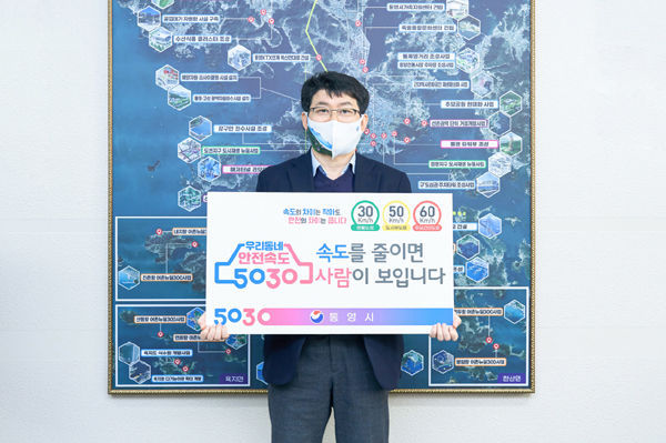 [경남도민뉴스] 통영시 김제홍 부시장은 3월 19일 안전속도 5030 전면 시행(`21. 4. 17시행)을 앞두고 차대 보행자 사고 발생이 집중되는 도시부 교통사고 감소를 위해 속도 하향 정책인 안전속도 5030 정책 추진을 통한 안전한 보행 환경조성에 기여하고자 ‘속도를 줄이면 사람이 보입니다’라는 구호를 쓴 피켓을 들고 안전속도 5030 릴레이 캠페인에 동참했다.