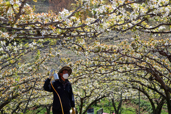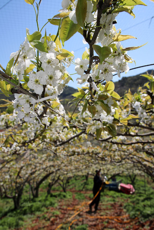 요즘 배 과수원은 배꽃이 만개해 꽃가루 인공수분이 한창이다.