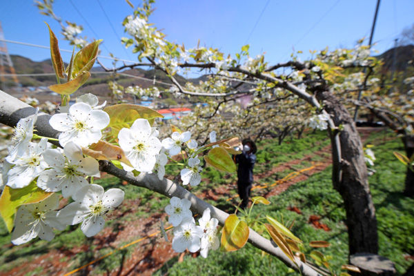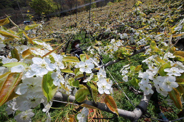 [경남도민뉴스] 6일 산청군 신안면 김동규(56)씨 배 과수원에 눈처럼 하얀 배꽃이 흐드러지게 폈다.