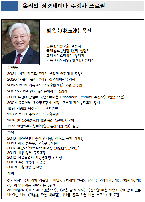 [경남도민뉴스] 1986년을 시작으로 매년 전국 주요 도시와 세계 각국에서 개최하며 기독교인들에게 ‘죄사함의 기쁨’과 ‘구원의 확신’을 주고 있는 ‘박옥수 목사 성경세미나’가 5월 10일부터 5일간 온라인으로 개최된다.