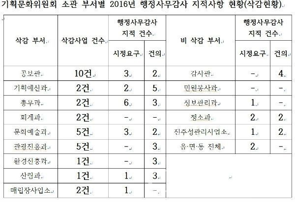 문화예술과는 읍·면·동 문화원 문화위원회 활성화 지원사업, 문화원 문화유적지 탐방 지원, 읍면동 풍물단 교육, 민속춤 보급 및 경연대회, 진주역사골든벨 사업이 삭감됐다.