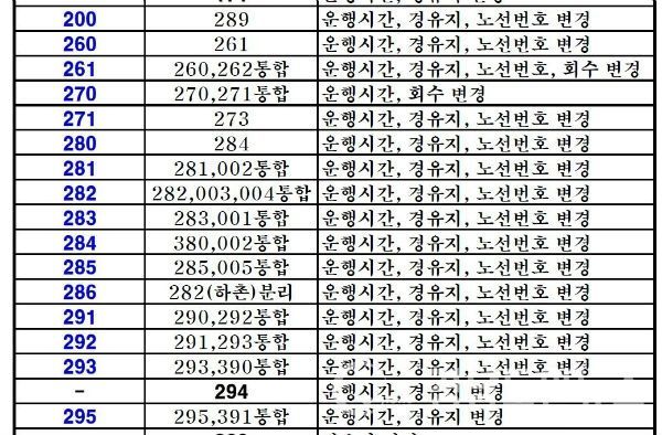 시는 1차 개편을 통해 기존 100개의 시내버스 노선을 89개 노선으로 통합·조정해 11개의 노선을 축소했고, 교통복지 차원에서 제공되던 동부 5개 면지역을 무료로 순환하던 시내버스는 특정지역에 형평성 문제가 제기돼 10여년 만에 전격 폐지했다고 전했다. 동부 5개면 지역의 기존 무료 이용객에 대해서는 65세 이상 노인 무료승차는 5월말까지만 유지한다는 방침이다.