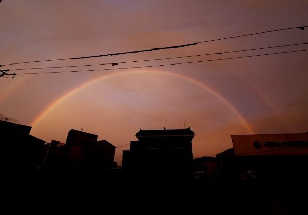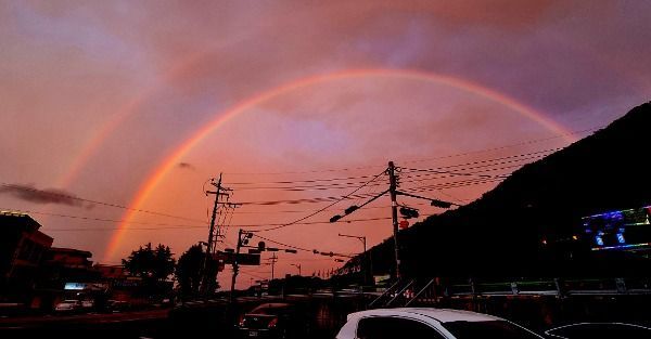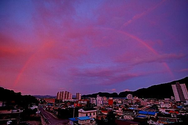 [경남도민뉴스] 4일 저녁 7시 30분 경 장마비가 내리다 잠시 그친 경남 의령군 의령읍 하늘에 쌍무지개가 20여분 동안 나타나 저녁노을과 어우러져 붉게 물들어 장관을 이루고 있다.