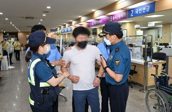 이날 훈련은 가해 민원인 진정·중재, 방문 민원인 대피, 가해 민원인 제압, 경찰 인계 순으로 진행됐다.