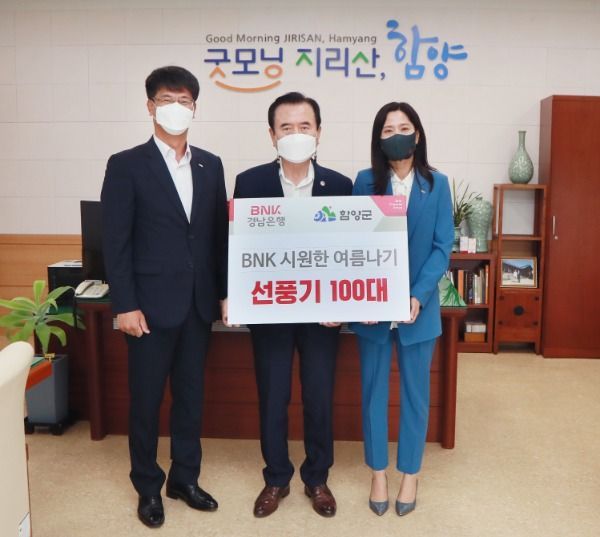 [경남도민뉴스] 함양군은 21일 오전 11시 BNK 경남은행 함양지점 서정익 지점장 등 2명이 함양군청을 방문해 관내 저소득층에게 전달해 달라며 선풍기 100대를 기탁했다고 밝혔다.