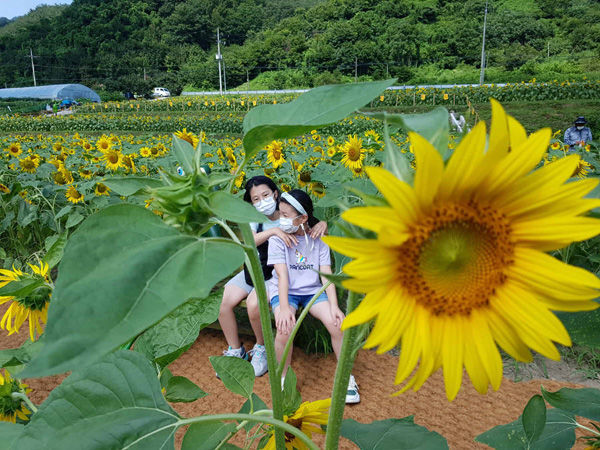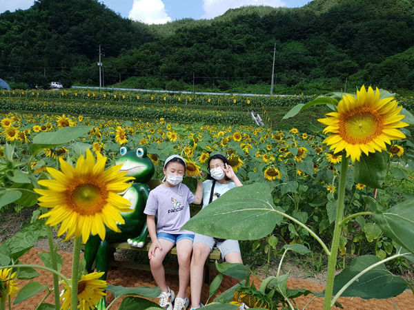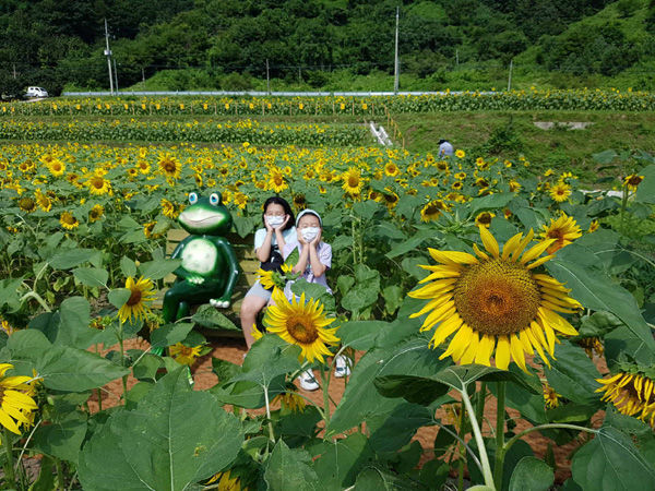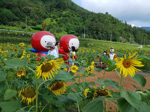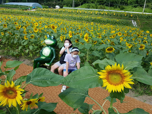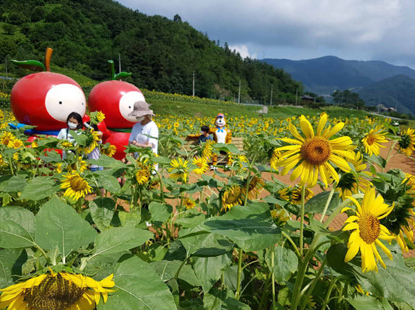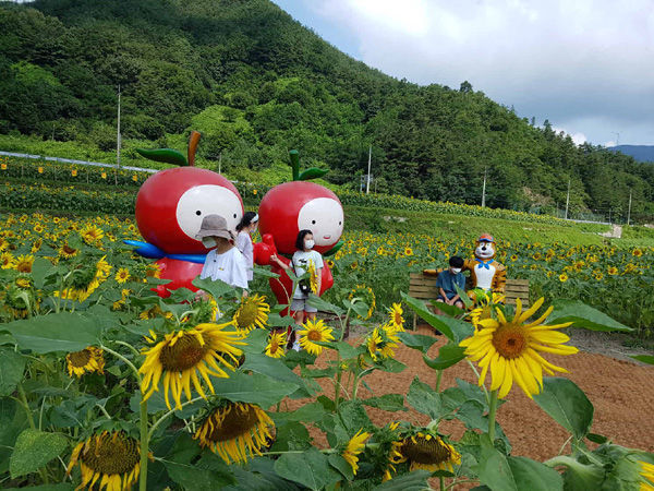 경관단지 해바라기꽃 관람은 캐릭터 조형물들과 함께하는 포토존도 마련되어 있으며, 오는 8월 22일까지 관람이 가능하다.