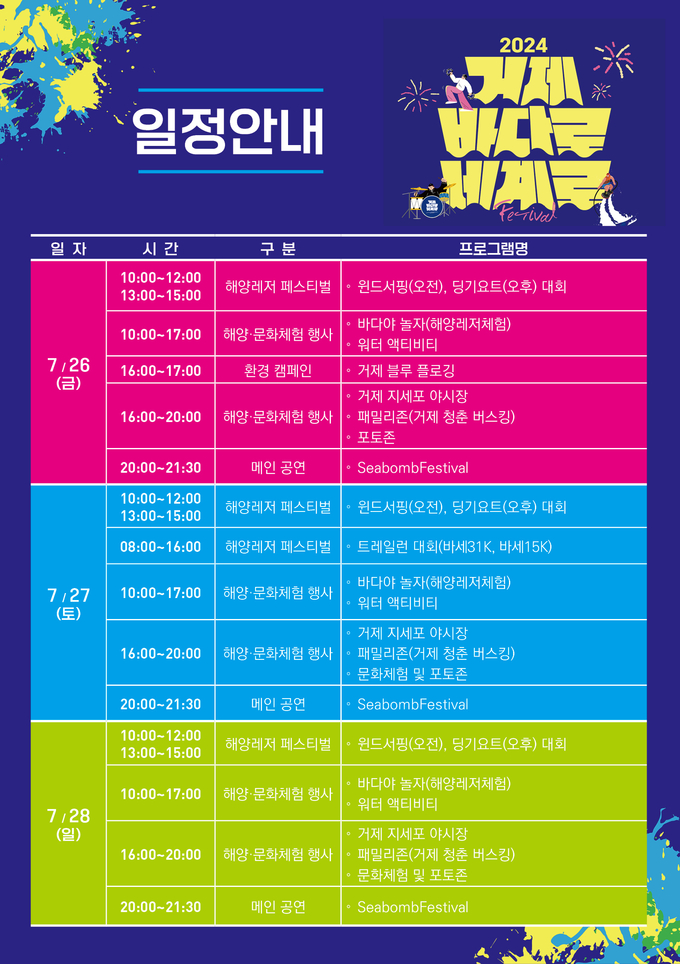 거제시가 후원하고 거제해양관광개발공사가 주최주관하는 이번 행사는 한여름 무더위를 날릴 각종 해양스포츠 대회를 비롯해 시민·관광객을 위한 Seabomb페스티벌, 해양문화체험부스, 플라잉보드쇼 등 다양한 프로그램이 준비되어 있다.