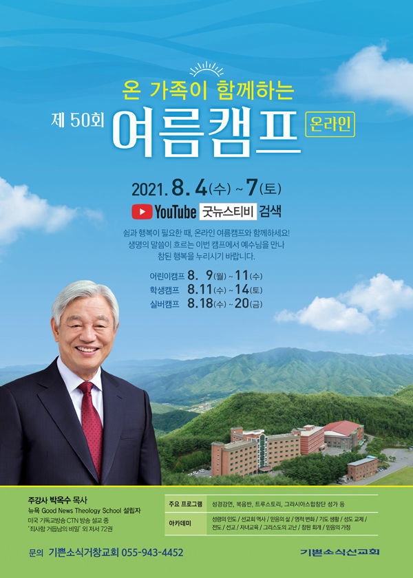 예수님에게로 마음을 옮기면 삶도 놀랍게 변화됩니다. 생명의 말씀이 흐르는 복된 온라인 여름캠프에서 예수님을 만나 참된 행복을 누리시기 바랍니다.