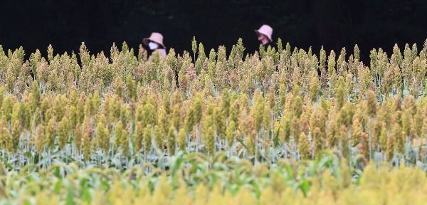 입추를 나흘 앞둔 3일 경남 함양군 상림공원에 심어진 수수길을 시민들이 걷고 있다.