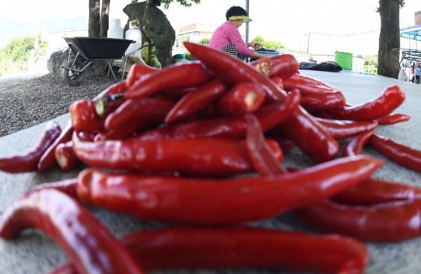 [경남도민뉴스] 고추가 빨갛게 익어가는 시기인 입추를 이틀 앞둔 5일 경남 거창군 위천면 상천리 덕거마을 어귀에서 한 어머니가 음식에 넣을 붉은 고추를 평상에 따다 놓았다.