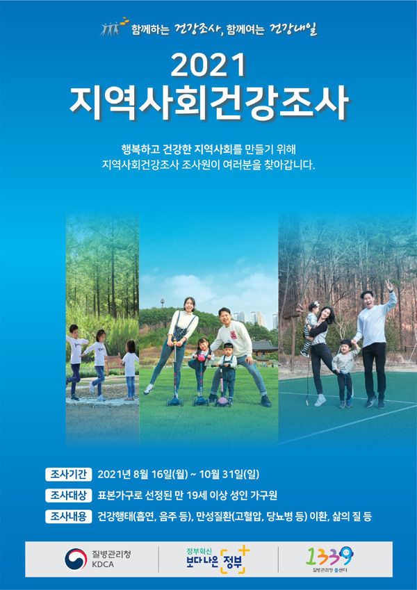 ‘지역사회건강조사’는 지역특성에 맞는 보건사업을 계획하기 위해 지역주민의 건강수준과 건강행태를 파악하고자 2008년부터 매년 질병관리청과 17개 시·도의 255개 보건소가 공동으로 수행하는 국가승인 통계조사이다.