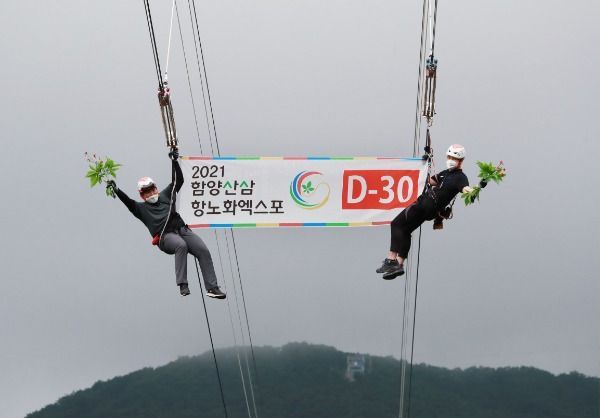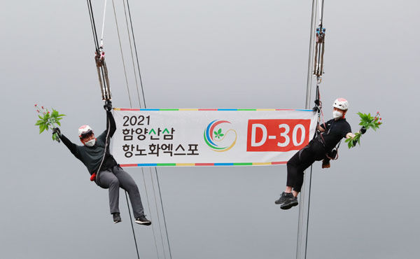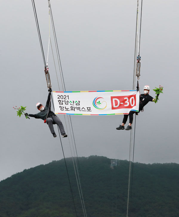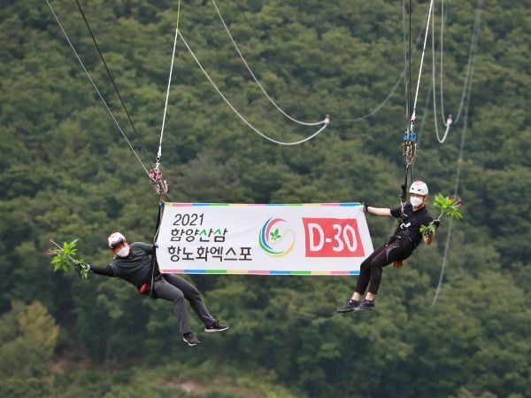 [경남도민뉴스] 2021함양산삼항노화엑스포 D-30일을 앞둔 11일 경남 함양군 병곡면 대봉산휴양밸리에서 안전요원들이 짚라인을 타며 퍼포먼스를 진행하고 있다. 2021함양산삼항노화엑스포는 상림공원 을 제1행사장, 대봉산휴양밸리는 제2행사장으로 ‘천년의 산삼, 생명연장의 꿈’이라는 주제로 다음달 10일부터 10월 10일까지 열린다.