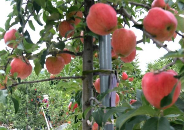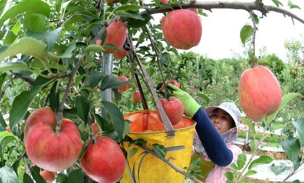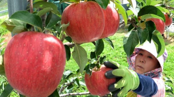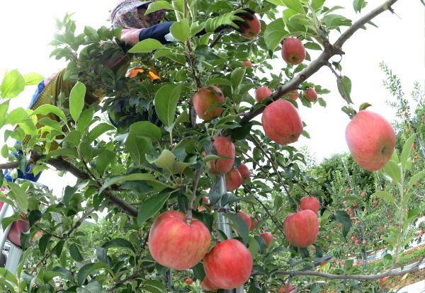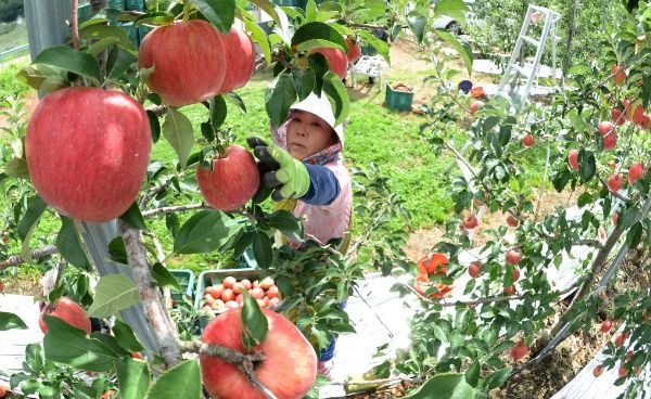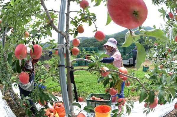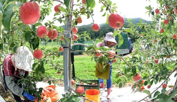 [경남도민뉴스] 17일 경남 거창군 고제면 봉산리 느티나무 사과 과수원에서 가을 첫 사과 홍로를 수확 하고 있다.