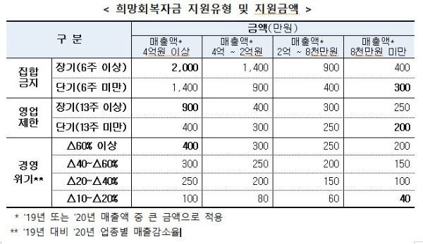 희망회복자금은 방역조치 수준(집합금지·영업제한·경영위기업종)과 방역조치 기간(장기·단기), 연 매출규모 등에 따라 32개 유형으로 구분된다.