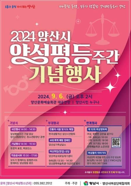 [경남도민뉴스=최미정 기자] 양산시는 9월 6일 오후 2시 양산문화예술회관에서 2024년 양성평등주간(9.1.부터 9.7.)을 맞아 양성평등 문화 확산을 위해 시민과 함께하는 다채로운 기념행사를 개최한다.