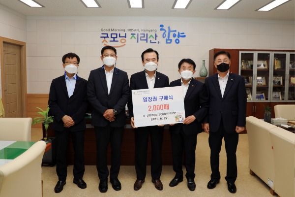 함양군에 따르면 27일 오후 신협중앙회(회장 김윤식)는 이동엽 부산경남지역본부장을 통해 이성국 함양신협 이사장과 함양군의회 이영재 의원(신협 이사)이 함께 함양군청을 찾아 함양엑스포 성공 개최를 응원하며 입장권 2,000매를 구매했다.