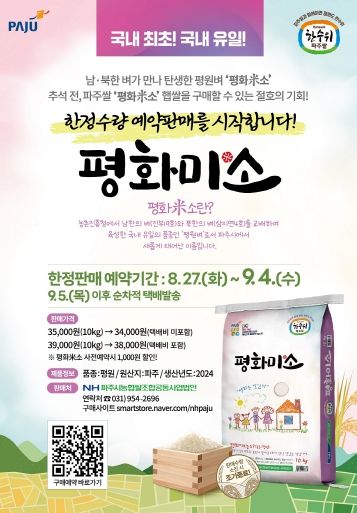 [경남도민뉴스=김미순 기자] 파주시가 국내 최초 남북 교배 품종인 평원벼를 파주쌀 ‘평화미소’로 상품화해 올 추석 햅쌀로 선보인다. 파주시 농협쌀조합공동사업법인은 온라인 판매처를 통해 4일까지 사전예약을 받아, 5일부터 순차 발송할 예정이다.