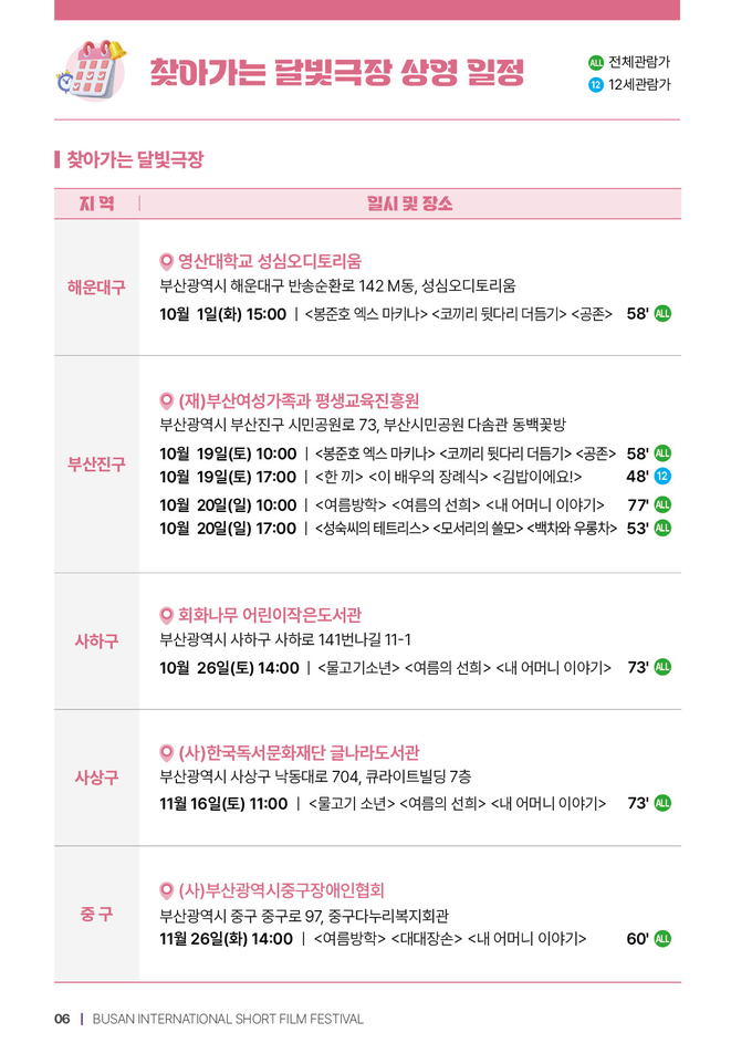 상영관은 작은영화 영화제, 부산사회복지종합센터, 동구 소년소녀합창단, 부산광역시립구덕도서관, 기장종합사회복지관 등 총 18곳으로, 이곳에서 상영회가 21회 열릴 예정이다.