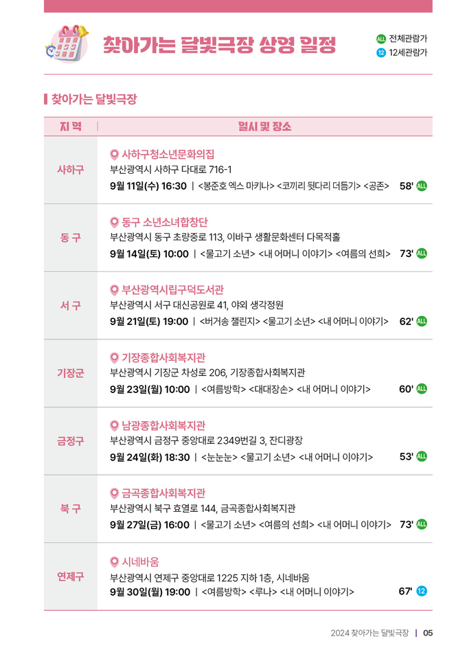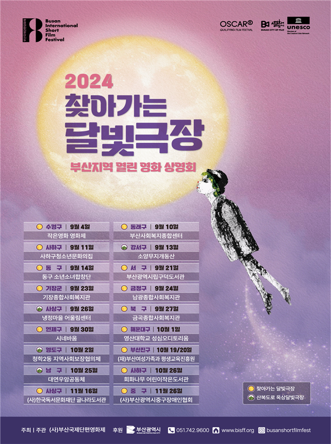 심재민 시 문화체육국장은 “올해 '찾아가는 달빛극장'은 부산시 16개 구·군을 모두 찾아가 더욱 뜻깊은 상영회가 될 것”이라며, “시원한 가을밤 달빛 아래 다양한 단편영화들을 사랑하는 가족과 함께 즐겨보시길 바란다”라고 전했다.