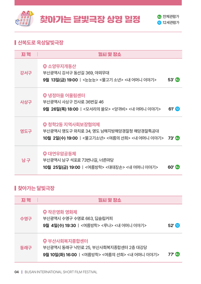 특히, 소양무지개동산, 냉정마을 어울림센터, 청학2동 지역사회보장협의체, 대연우암공동체 상영은 산길을 따라 굽이굽이 이어진 산복도로 달빛 라인을 따라 부산항의 야경과 도심을 배경으로 단편영화를 감상할 수 있어 상영관을 찾은 관람객들에게 더욱 특별한 추억을 선사할 것으로 기대된다.