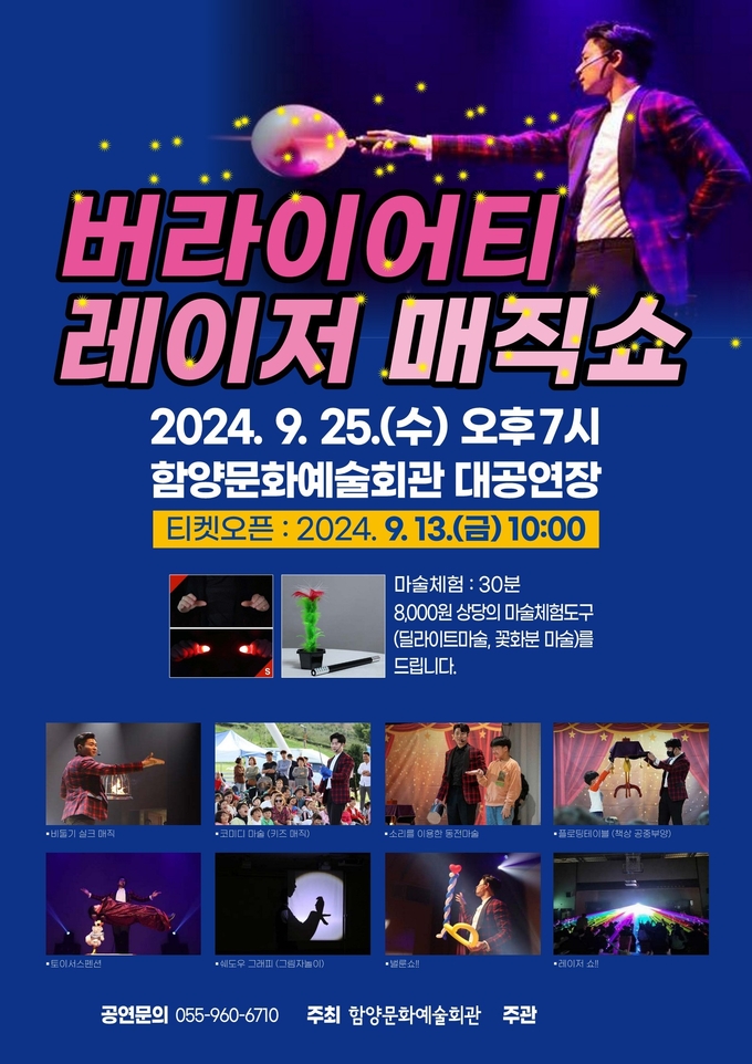 [경남도민뉴스=장광동 기자] 함양군 문화시설사업소는 문화가 있는 날 9월 행사로 오는 25일(수) 오후 7시 함양군문화예술회관 대공연장에서 ‘버라이어티 레이져 매직쇼’ 공연을 개최한다고 밝혔다.