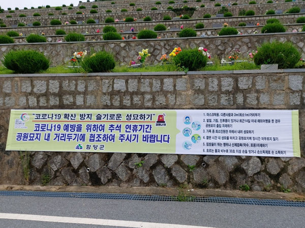 [경남도민뉴스] 함양군이 추석 명절을 맞아 코로나19 확산 방지 및 예방을 위해 성묘객들의 사회적 거리두기 실천 등 방역수칙 준수 홍보에 나섰다.