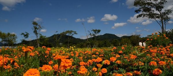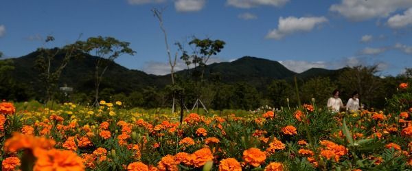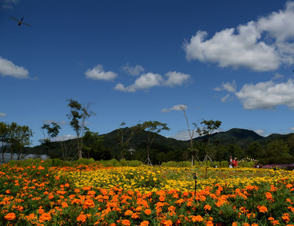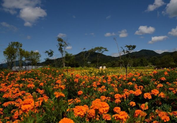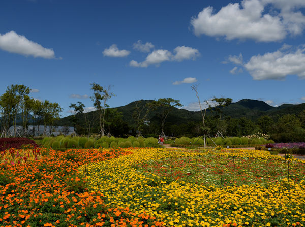 [경남도민뉴스] 모처럼 맑은 날씨를 보인 8일 경남 거창군 남상면 창포원에서 활짝핀 가을 꽃길을 방문객들이 거닐고 있다.