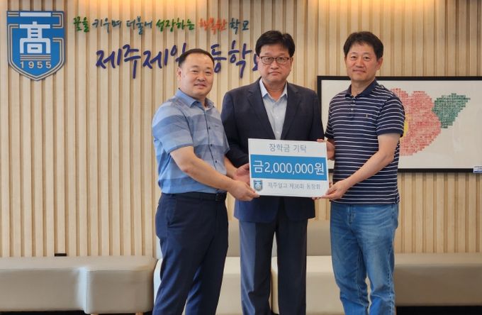 [경남도민뉴스=경남도민뉴스 기자] 제주도교육청 제주제일고등학교 제30회 동창회는 24일 제주제일고등학교을 방문해 모교 재학생들을 위한 장학금 200만원을 기탁했다.