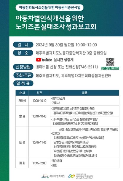 [경남도민뉴스=경남도민뉴스 기자] 제주특별자치도와 (재)제주특별자치도사회서비스원 제주특별자치도육아종합지원센터는 오는 30일 오전 10시 제주도노동자종합복지관 3층 중회의실에서 제주지역 노키즈존 실태조사 성과보고회를 연다.