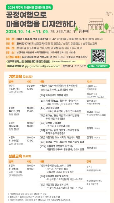 마을여행 큐레이터 교육은 마을 자원을 여행 상품화할 수 있도록 여행 기획 및 해설 등을 할 수 있는 자를 양성하는 것으로, 교육대상은 제주시 관내 마을단위 주민이면서 교육이수 후 마을여행 큐레이터 활동이 가능한 자이다.