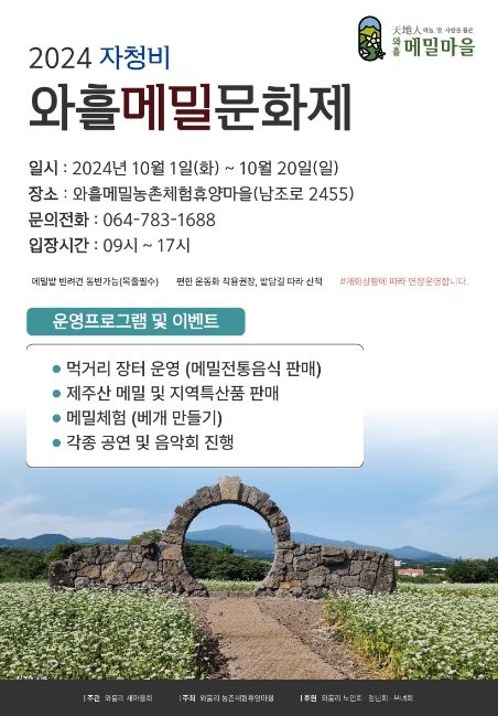 [경남도민뉴스=경남도민뉴스 기자] 제주시 조천읍은 10월 1일부터 10월 20일까지 와흘리 일원에서 와흘리새마을회·와흘리농촌체험휴양마을이 주최·주관하는 2024 자청비 와흘메밀문화제를 개최한다.