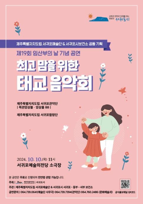 [경남도민뉴스=경남도민뉴스 기자] 서귀포시는 오는 10월 10일 11시 서귀포예술의전당 소극장에서 제19회 임산부의 날을 기념하여 '최고 맘을 위한 태교음악회'를 진행한다.
