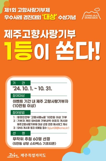 [경남도민뉴스=경남도민뉴스 기자] 제주특별자치도가 제1회 고향사랑기부제 우수사례 경진대회에서 대상을 수상한 것을 기념해 10월 한 달간 특별 이벤트를 실시한다.