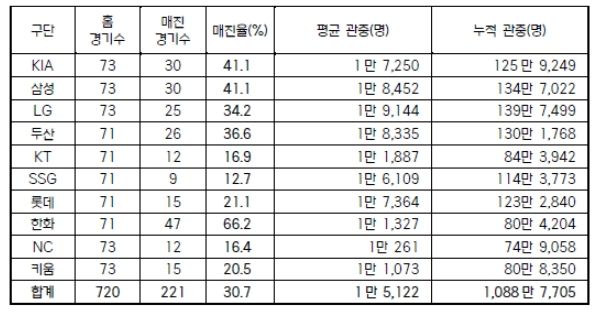 뒤이어 KIA가 125만 9,249명(평균 1만 7,250명), 롯데가 123만 2,840명(평균 1만 7,364명), SSG가 114만 3,773명(평균 1만 6,109명)으로 100만 관중을 넘었다.