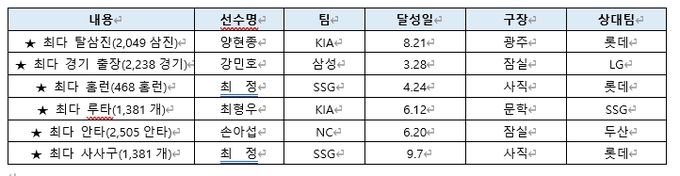SSG 최정은 4월 24일 롯데와의 경기가 펼쳐진 사직에서 5회, 개인 468홈런을 완성하며 최다 홈런 신기록을 작성했다. 6월 12일에는 KIA 최형우가 문학에서 SSG를 상대로 5회 안타를 쳐내며 개인 통산 최다 루타 신기록을 4,078루타로 갈아치웠다. 두 기록 모두 종전 이승엽(전 삼성)이 보유하고 있던 기록이었다.