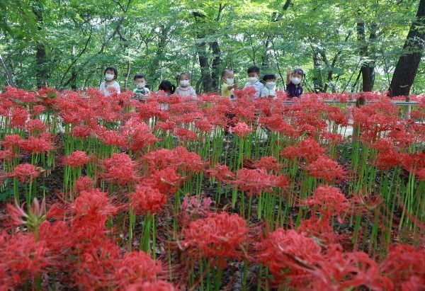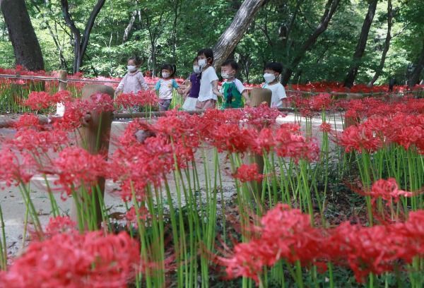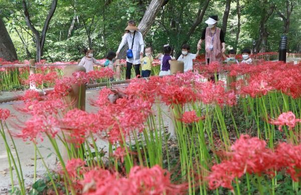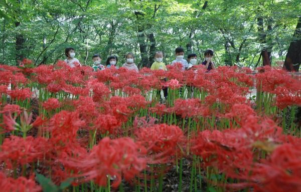 [경남도민뉴스] 15일 경남 함양군 상림공원을 찾은 어린이들이 활짝 핀 꽃무릇을 감상하고 있다.