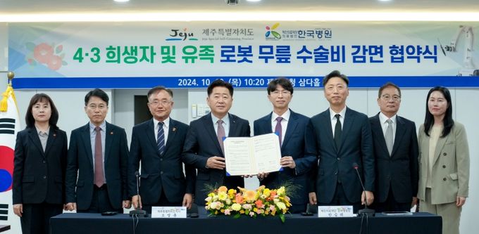 제주도는 10일 오전 10시 20분 제주도청 삼다홀에서 혜인의료재단과 ‘4·3희생자 및 유족 로봇 무릎 인공관절 수술비 감면사업’을 위한 업무협약을 체결했다.