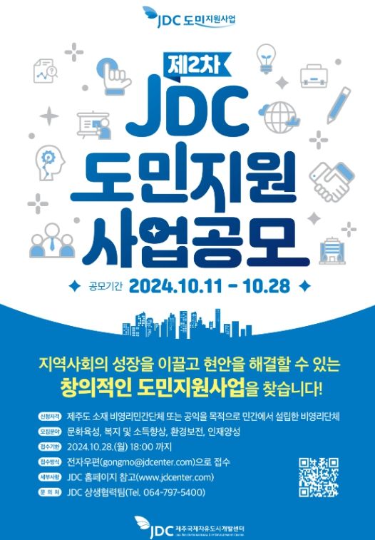 [경남도민뉴스=공동취재 기자] 제주국제자유도시개발센터가 지난 11일 '2024년 제2차 JDC 도민지원사업'공개모집 접수를 시작했다고 밝혔다.