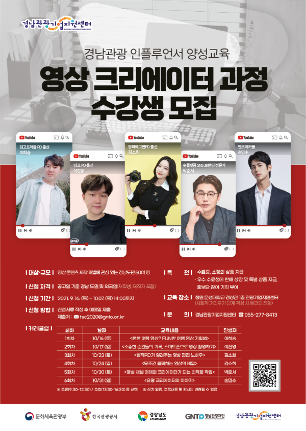 인플루언서 양성교육은 10월 16일부터 10월 31일까지 6주간 매주 토·일요일에 경남관광기업지원센터에서 진행하며 외국인 수강생의 의사소통을 지원하기 위해 영어 전담 인력을 배치할 예정이다.