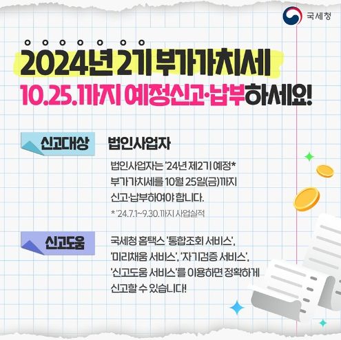 법인사업자는 ’24년 제2기 예정* 부가가치세를 10월 25일(금)까지 신고·납부하여야합니다.
