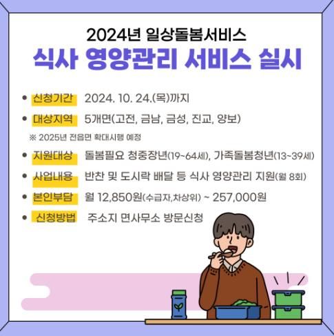 서비스 대상 지역은 고전․금남․금성․진교․양보 5개 면이며, 지원 대상은 질병, 부상 등으로 일상생활에 다른 사람의 도움이 필요한 청․중장년 또는 혼자 일상생활이 어려운 가족을 돌보는 청년이다.