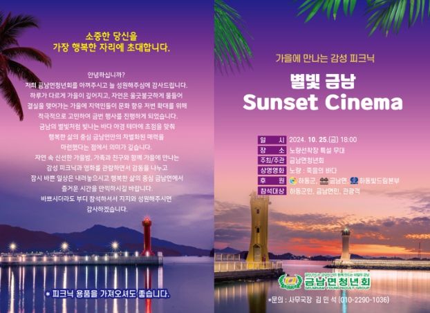 [경남도민뉴스=이형섭 기자] 오는 25일 18시 하동군 금남면 노량 선착장 특설무대에서 ‘별빛 금남 Sunset Cinema’가 개최된다.