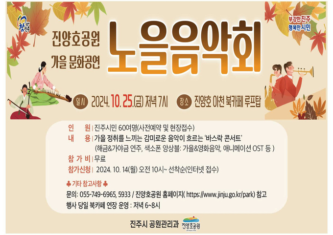 진주시 관계자는 “진양호반 물빛을 타고 흐르는 감미로운 은빛 선율과 가을의 향기가 짙어지는 진양호의 자연 속에서 활력을 되찾아갈 수 있는 이번 행사에 시민들의 많은 참여를 바란다”고 말했다.
