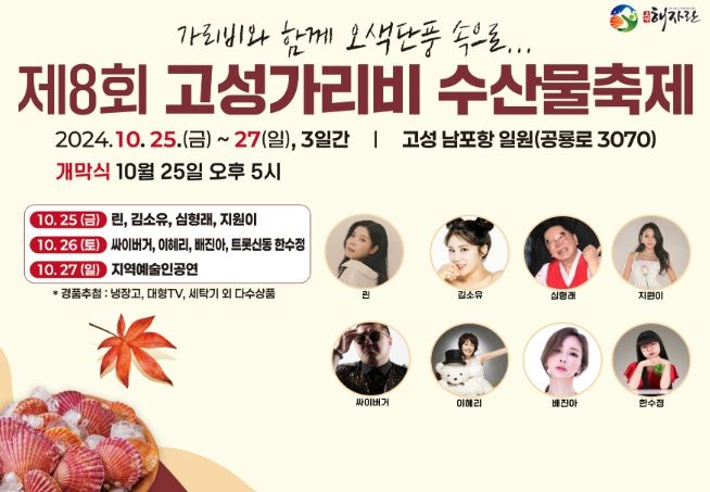 군민뿐만 아니라 전국 각지의 관광객이 찾는 ‘고성 가리비 수산물축제’는 올해 8회째를 맞이해 ‘가리비와 함께 오색단풍 속으로’라는 주제로 진행된다.