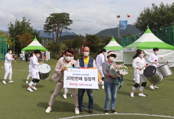 20만번째 주인공이 된 두 사람은 경남 창원시에서 엑스포를 관람하러 온 부부로 이들에게 축하 꽃다발과 10년근 함양산삼 4뿌리를 경품으로 증정됐다.
