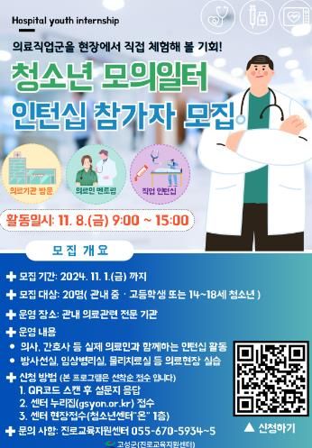 [경남도민뉴스=이형섭 기자] 고성진로교육지원센터는 관내 의료 관련 전문기관 연계를 통한 ‘청소년 모의 일터 인턴십’ 참가 청소년을 11월 1일까지 모집한다고 밝혔다.