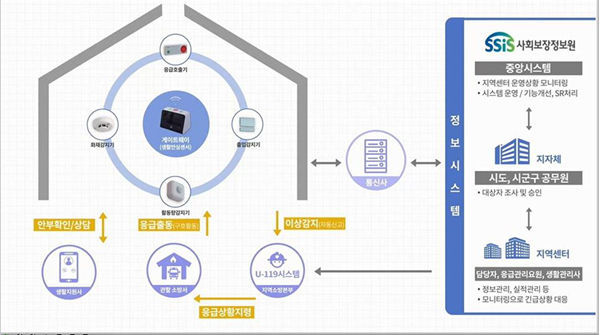 신규 도입된 차세대 댁내장비는 태블릿PC 기반 게이트웨이, 응급호출기, 화재감지기, 활동량감지기, 조도·습도·온도감지센서 등 총 5가지 장비로 구성되어 있어 독거어르신 댁내에서 화재, 사고, 질환 등 응급상황 발생 시 실시간으로 119안전센터에 연계되어 신속 대응을 하게 되고, 사업 수행인력(응급관리요원·생활지원사)을 통해 사후관리를 받게 되어 더욱 촘촘한 서비스 지원이 이루어지고 있다.